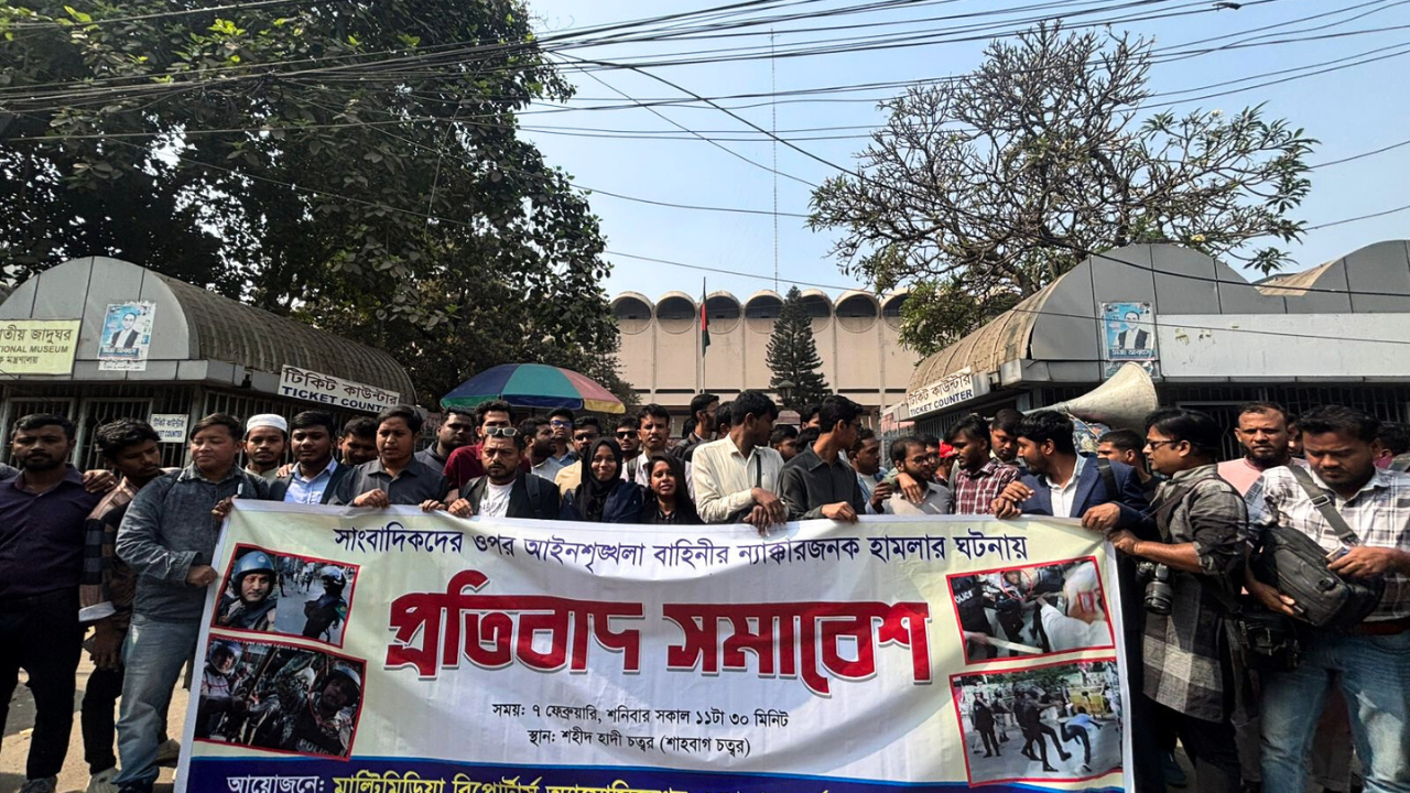 সাংবাদিকদের ওপর আইনশৃঙ্খলা বাহিনীর হামলার প্রতিবাদে রাজধানীর শাহবাগে সমাবেশ করেছে মাল্টিমিডিয়া রিপোর্টার্স অ্যাসোসিয়েশন। এ সমাবেশে ঢাকায় কর্মরত বিভিন্ন গণমাধ্যমের সাংবাদিকরা অংশ নেন।